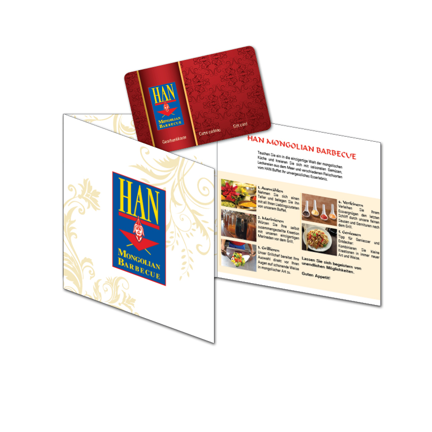 Die Geschenk-Karten inklusive einer edlen Geschenkverpackung können direkt in jedem HAN Mongolian Barbecue gekauft werden